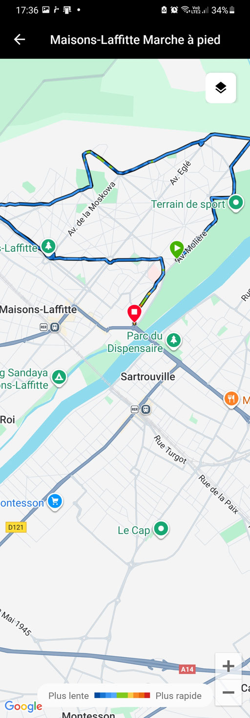 De retour à la place du Château, nous prenons la direction de notre point final du parcours (devant le château de Maisons-Laffitte), ce qui nous fera une distance de presque 9 km.